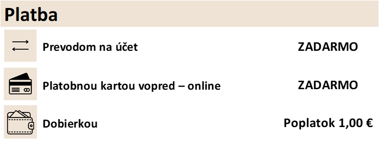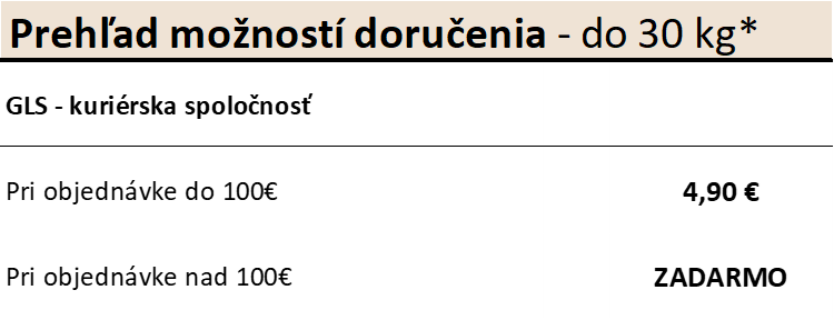 *Ak balík presahuje maximálne rozmery vzhľadom k jeho hmotnosti, objednávka bude rozdelená do 2 balíkov. Za druhý balík je účtovaná suma 3,90 € (= dvojbalíková objednávka). Neplatí to pre dopravu zadarmo (pri 2 balíkoch nad 200 €).