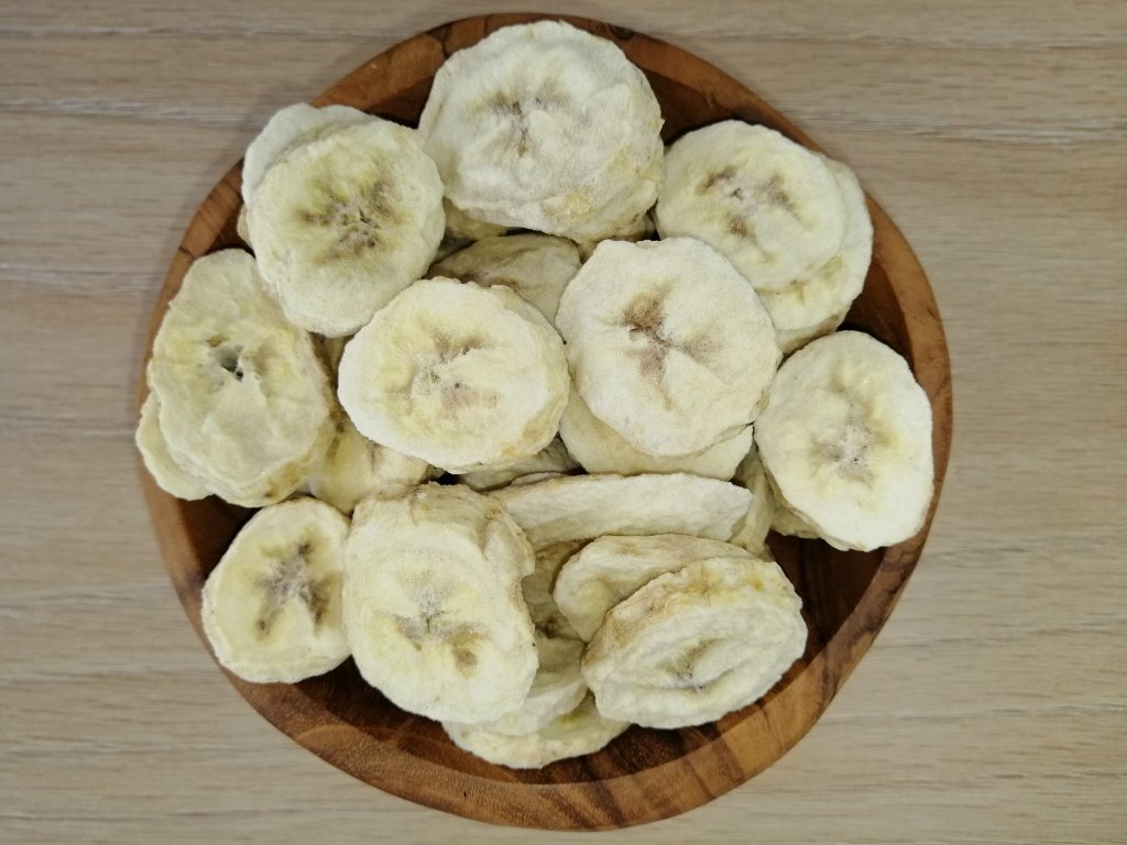 Banán prechádza procesom lyofilizácie, teda hlbokým zmrazením pri veľmi nízkom tlaku, a preto si zachováva všetky jedinečné vlastnosti čerstvého ovocia, ktoré nie je ukrátené o žiadnu z týchto zložiek: vláknina, vitamíny, minerály, antioxidanty a ďalšie dôležité živiny.