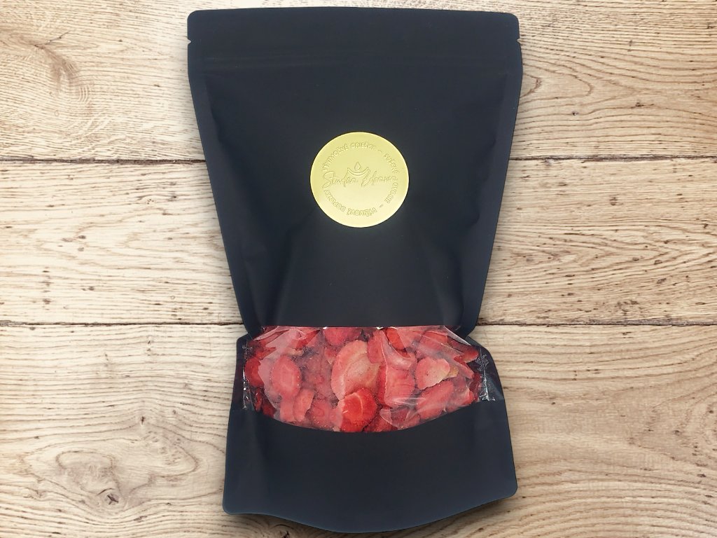 Mrazom sušené jahody si Vás získajú pre svoju intenzívnu a sladkú chuť a taktiež musíme spomenúť ich úžasnú vôňu. Jahody si Vás získajú najmä svojou vôňou a chuťou. Každá jedna jahoda je veľmi chutná, chrumkavá, preto budete musieť dávať veľký pozor, aby Vám vrecko vydržalo aspoň do večera. Sú chrumkavé, sladké a čo je najlepšie, môžete ich mať u seba v kuchyni celoročne! Nielenže sú chutné, ale majú toľko pozitív, že ak ste ich doteraz príliš nejedli, mali by ste začať. Jahody zďaleka nie sú len obľúbeným letným ovocím, na ich nezameniteľnú chuť nadväzujú aj vysoké množstvá vitamínov, minerálov a vlákniny.