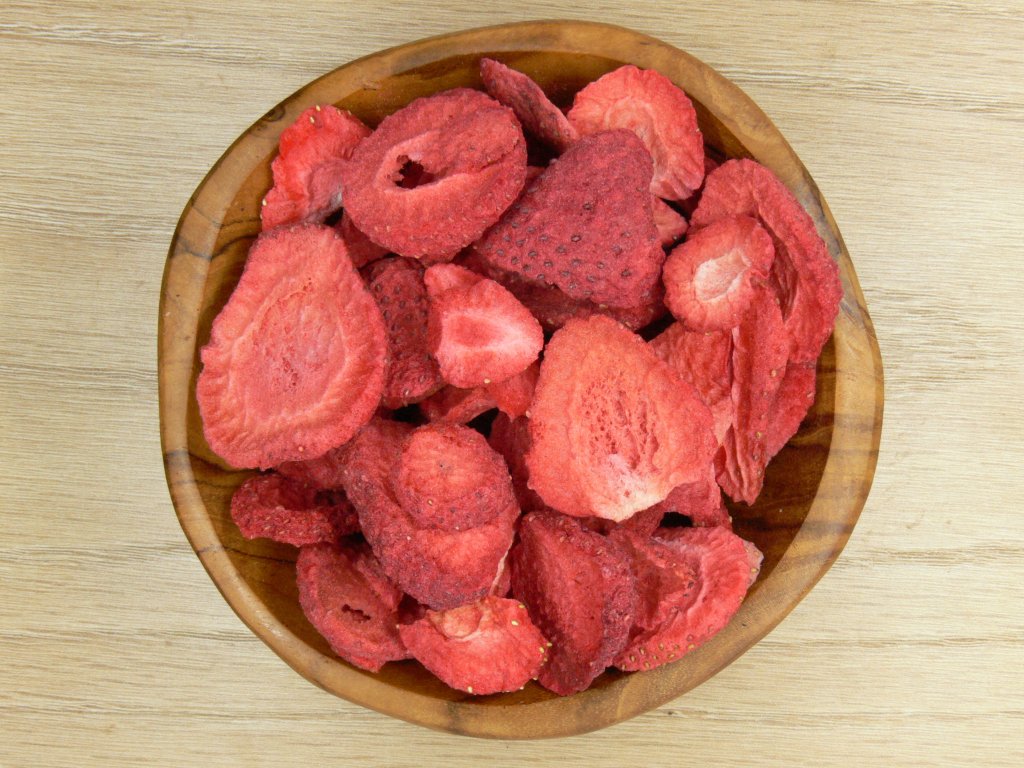 Mrazom sušené jahody si Vás získajú pre svoju intenzívnu a sladkú chuť a taktiež musíme spomenúť ich úžasnú vôňu. Jahody si Vás získajú najmä svojou vôňou a chuťou. Každá jedna jahoda je veľmi chutná, chrumkavá, preto budete musieť dávať veľký pozor, aby Vám vrecko vydržalo aspoň do večera. Sú chrumkavé, sladké a čo je najlepšie, môžete ich mať u seba v kuchyni celoročne! Nielenže sú chutné, ale majú toľko pozitív, že ak ste ich doteraz príliš nejedli, mali by ste začať. Jahody zďaleka nie sú len obľúbeným letným ovocím, na ich nezameniteľnú chuť nadväzujú aj vysoké množstvá vitamínov, minerálov a vlákniny.