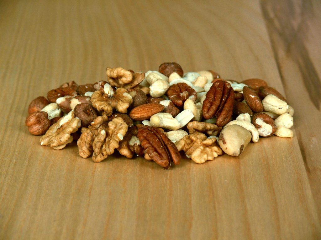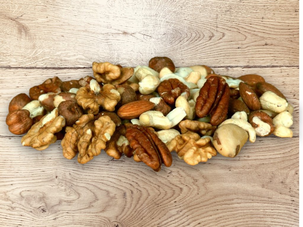 Orechová zmes je namiešaná v rovnakom pomere orechov.