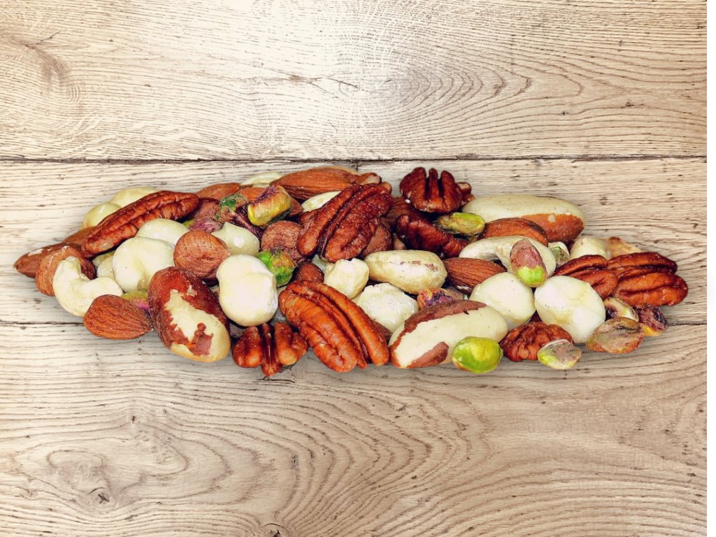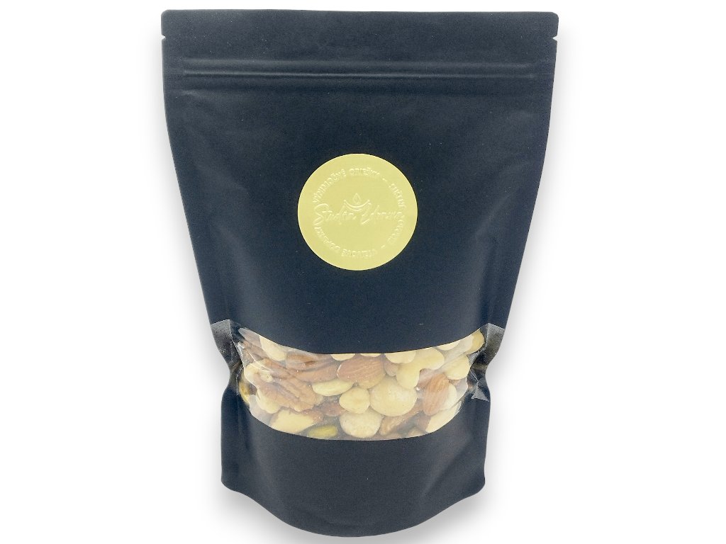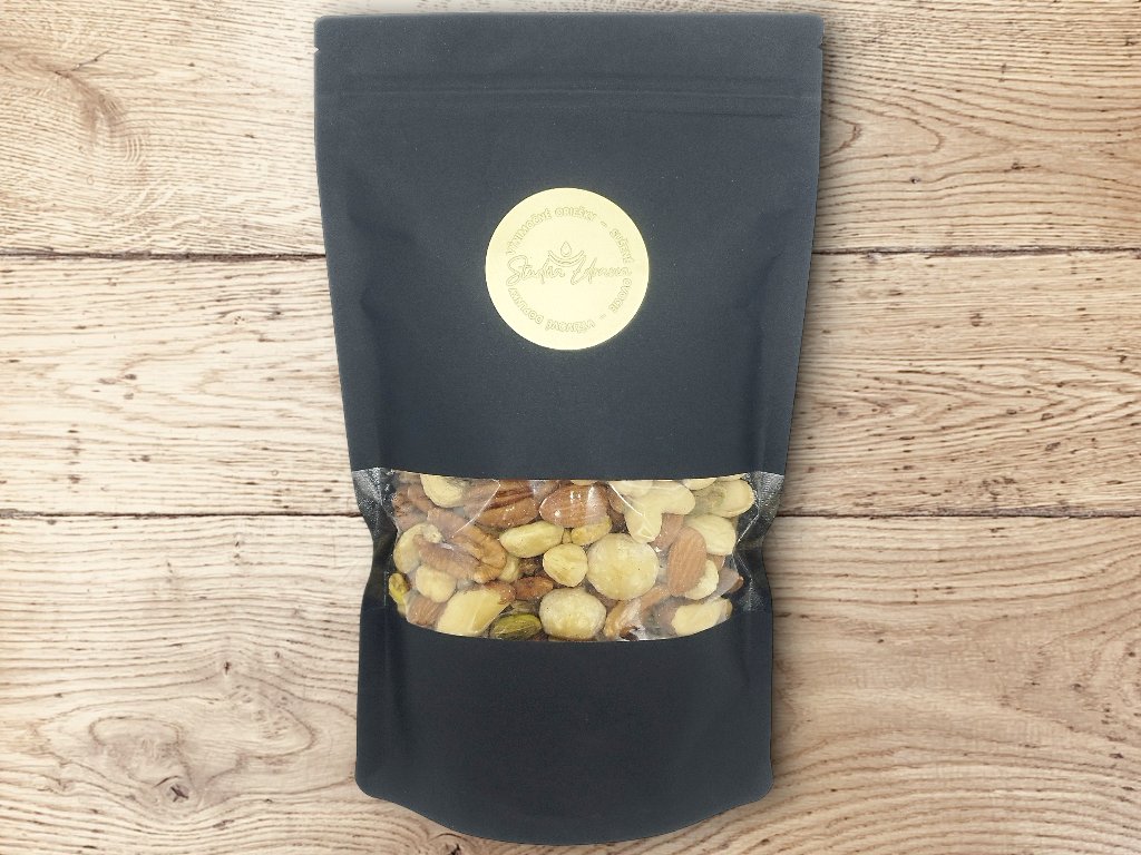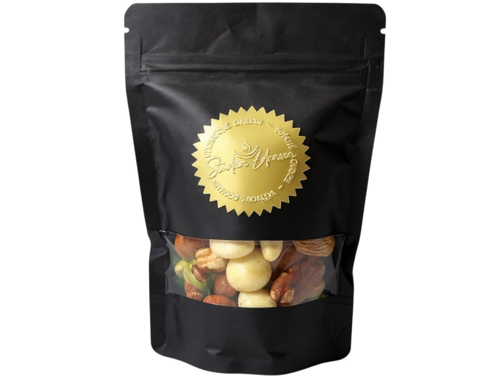 Zloženie: kešu natural, lieskové orechy, mandle natural, pekanové orechy, mandle lúpané, pistácie lúpané, makadamové orechy.