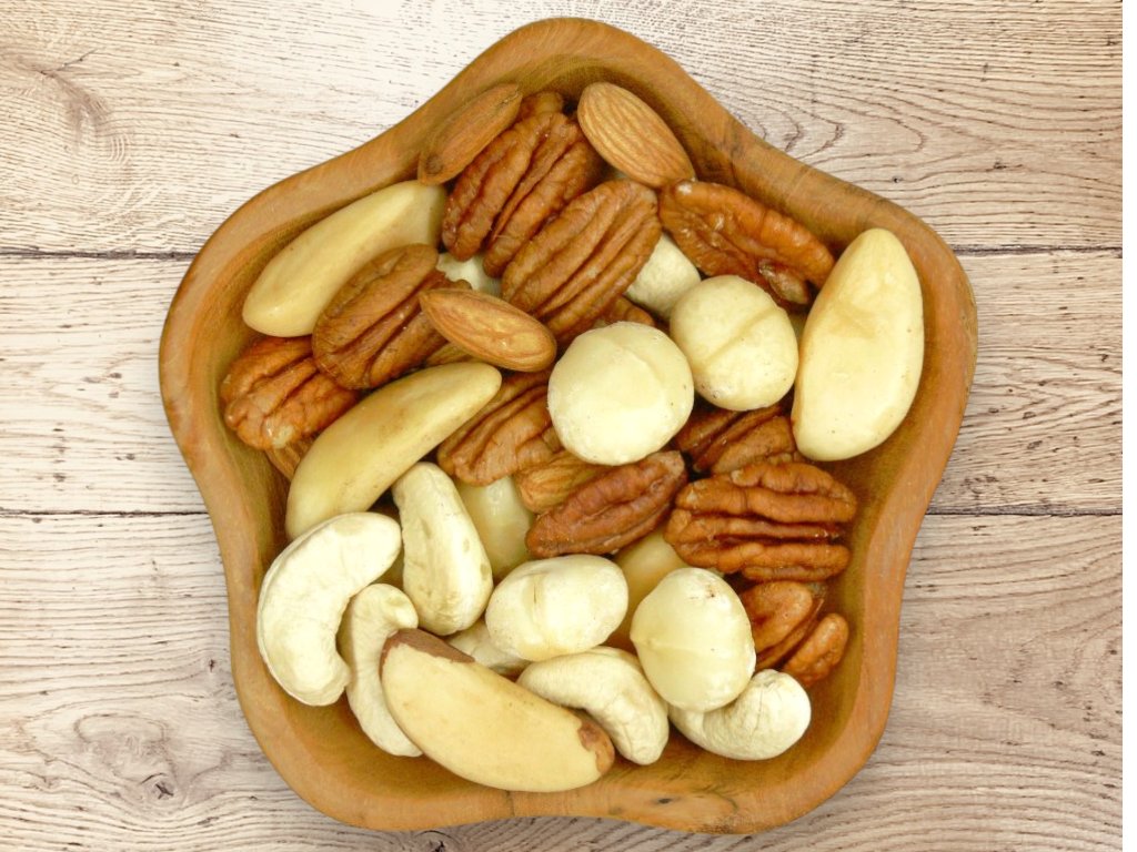 Orechová zmes je namiešaná v rovnakom pomere orechov.